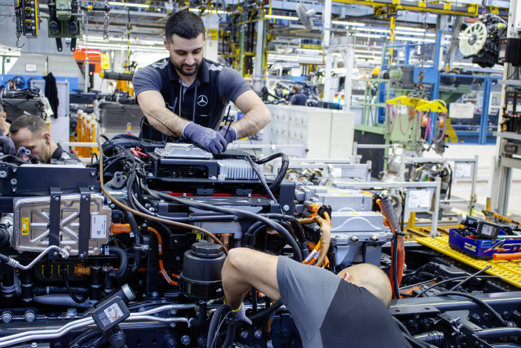 La catena di montaggio della nuova generazione di camion elettrici pesanti è pienamente integrata nella linea esistente dedicata alla serie A. A differenza della prima generazione, assemblata nel Future Truck Center, i nuovi modelli vengono costruiti direttamente all’interno della struttura principale: dal telaio al collaudo finale. Questa scelta consente una produzione parallela di veicoli elettrici e diesel, aumentando la flessibilità industriale e riducendo i tempi di risposta alla domanda. Componenti chiave del sistema elettrico – come l’assale motore e la “front box” ad alta tensione – provengono dagli stabilimenti Daimler di Mannheim, Kassel e Gaggenau. La riorganizzazione produttiva riflette la strategia di Mercedes-Benz Trucks di consolidare la propria posizione di leadership in Europa, dove ha raggiunto una quota del 50% nel segmento dei camion elettrici pesanti nel terzo trimestre del 2025.